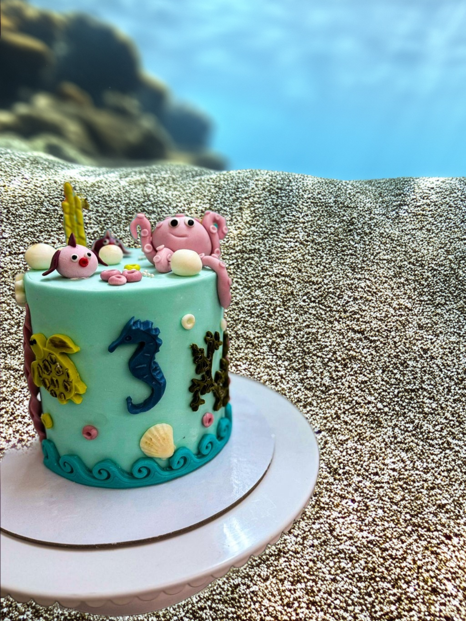 Pastanın açık mavi krema kaplaması, okyanusun sakin sularını temsil ederken, üzerindeki sevimli deniz canlıları figürleri - pembe ahtapot, denizatı, deniz kabukları, deniz yıldızları ve sevimli balıklar - pastaya neşeli bir hava katıyor. Yan tarafındaki yosun ve mercan detayları ise su altı temasını tamamlıyor. Pastanın ön yüzeyindeki lacivert "3" rakamı ise bu özel yaşı vurguluyor.