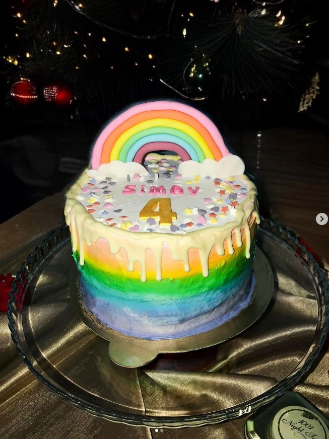 - Detaylar: Gökkuşağı renklerinde katmanlar, beyaz krema akıntısı, bulut şeklinde süslemeler, renkli yıldız sprinkles