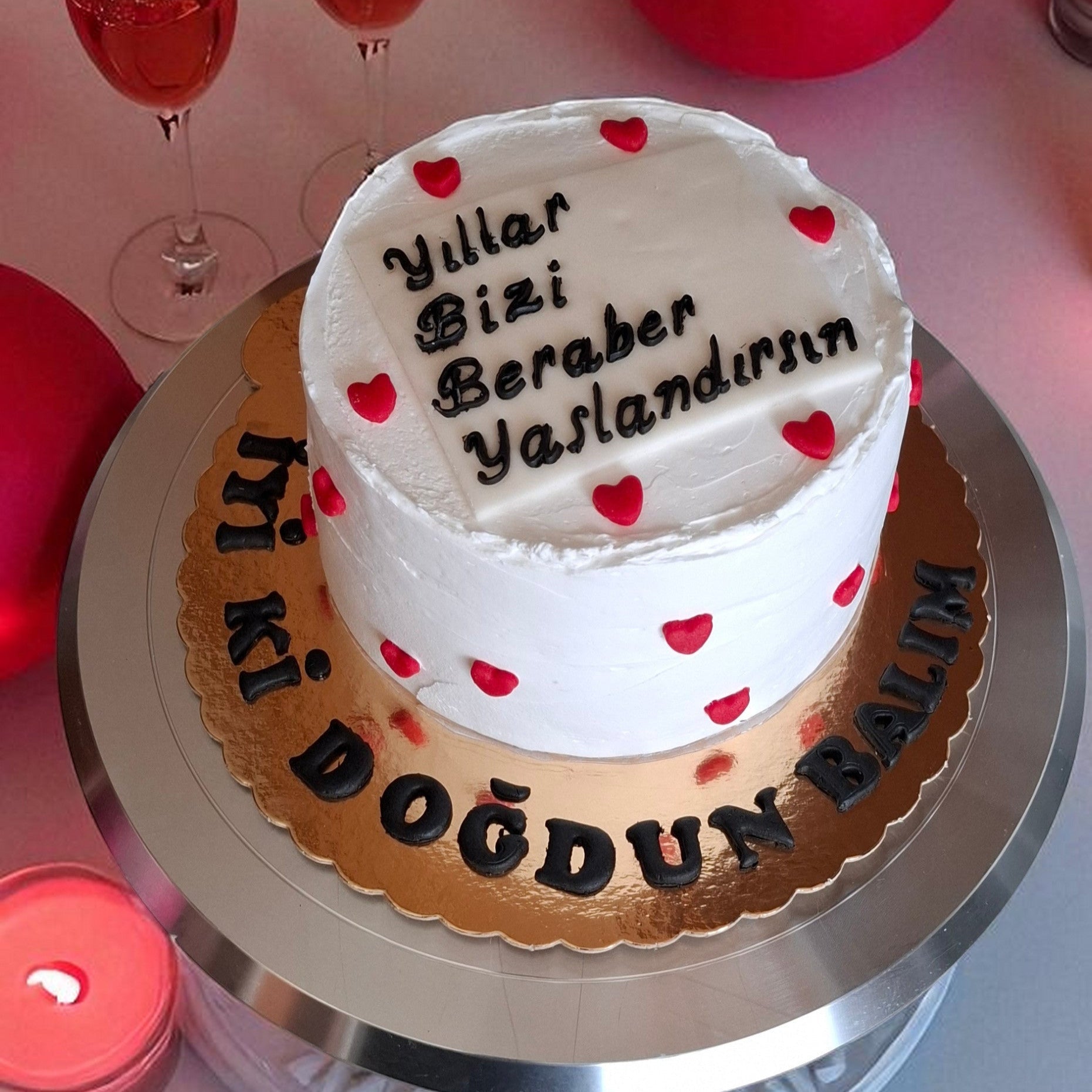 Sevgilinize, eşinize ya da birlikte yaş almak istediğiniz özel kişiye duygusal bir sürpriz yapmak istiyorsanız, bu pasta tam size göre! Beyaz zemin üzerine kırmızı kalplerle süslenmiş tasarımı ve “Yıllar Bizi Beraber Yaşlandırsın” yazısıyla kalpleri ısıtan bu özel pasta, romantik kutlamaların başrolünü üstleniyor.