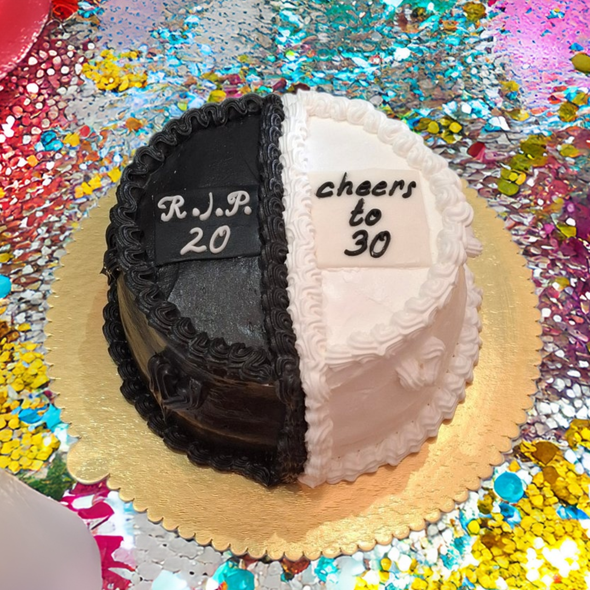 30. yaş için esprili bir dokunuşla hazırlanan bu pasta, yarısı siyah “R.I.P 20” (20’lere veda), yarısı beyaz “Cheers to 30” (30’a selam) konseptiyle dikkat çekiyor.