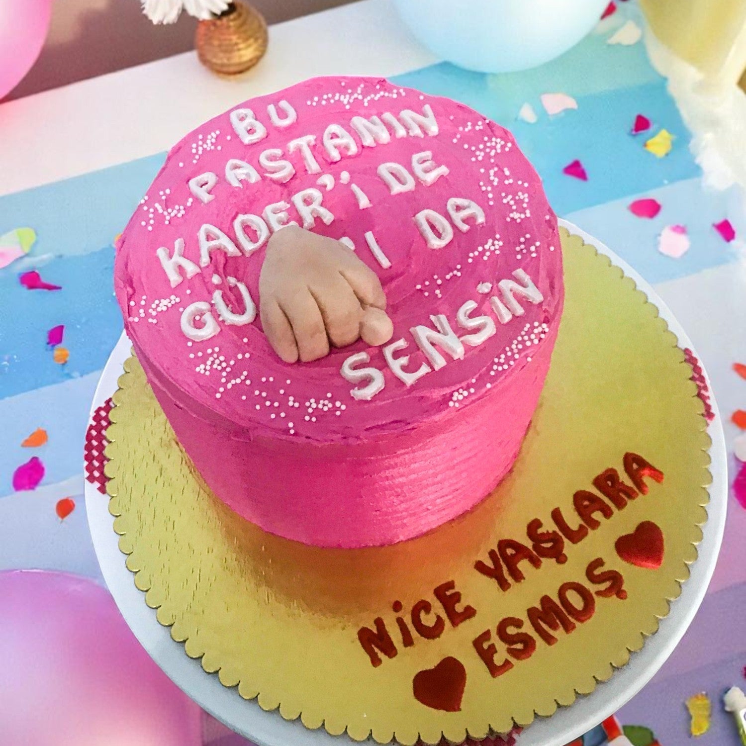 Doğum günü kutlamalarına biraz mizah ve bolca sevgi katın! Bu özel tasarım pembe pasta, üzerindeki esprili mesajıyla unutulmaz bir sürpriz olmaya aday. "BU PASTANIN KADERİ DE GÜNAHI DA SENSİN" yazısı ve ortasındaki el figürü, doğum günü sahibine tatlı bir gönderme yaparken, kutlamaya eğlenceli bir hava katıyor.