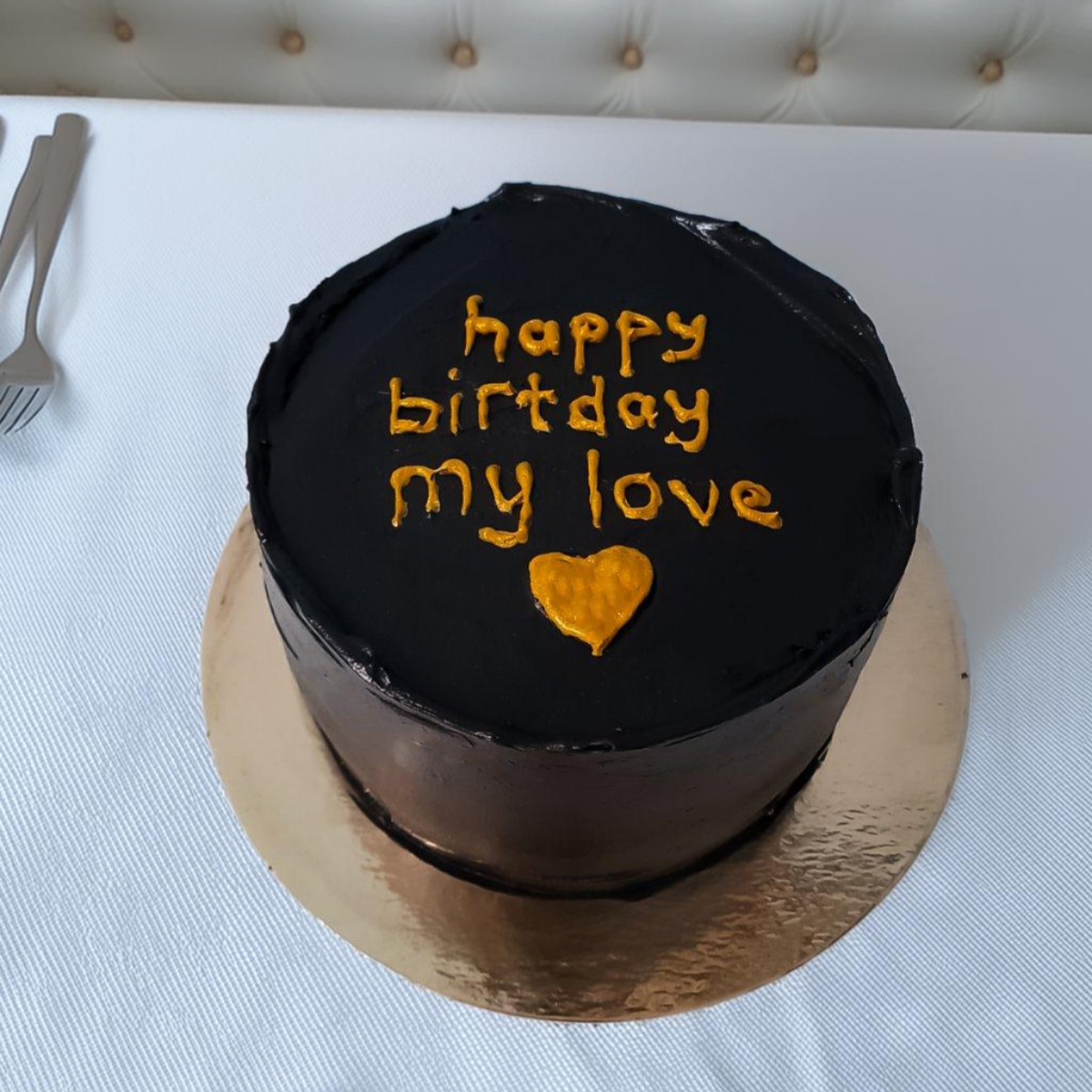 Pastanın derin siyah krema kaplaması, altın rengi yazı ve kalp ile lüks ve göz alıcı bir kontrast oluşturuyor. "Happy Birthday My Love" mesajı, sevgilinize olan derin duygularınızı en güzel şekilde yansıtırken, altın rengi kalp ise ilişkinizin sıcaklığını ve samimiyetini simgeliyor.