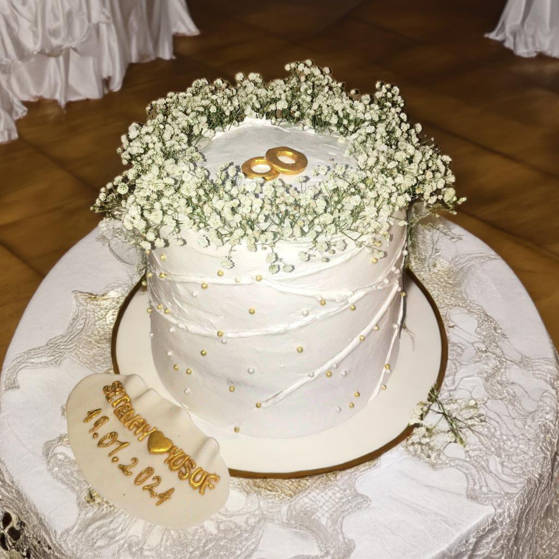 Pastanın pürüzsüz beyaz krema kaplaması, üzerindeki minik altın rengi inci taneleriyle zarif bir ışıltı kazanıyor. En üst katı çevreleyen bembeyaz cipso çiçekleri, pastaya doğal ve romantik bir dokunuş katarken, ortasında parlayan altın rengi alyans figürleri birliğinizi ve sonsuz sevginizi simgeliyor.